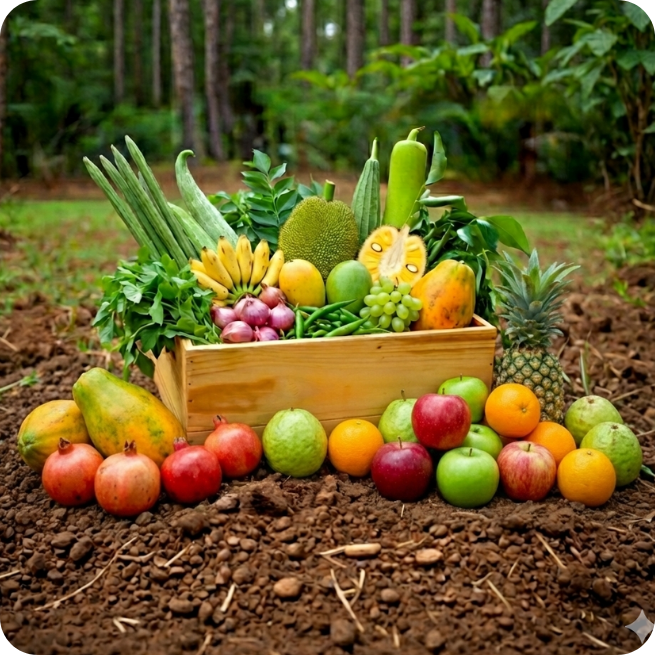 It includes a curated mix of 100% natural vegetables, fruits, and essentials, harvested specifically for your order.